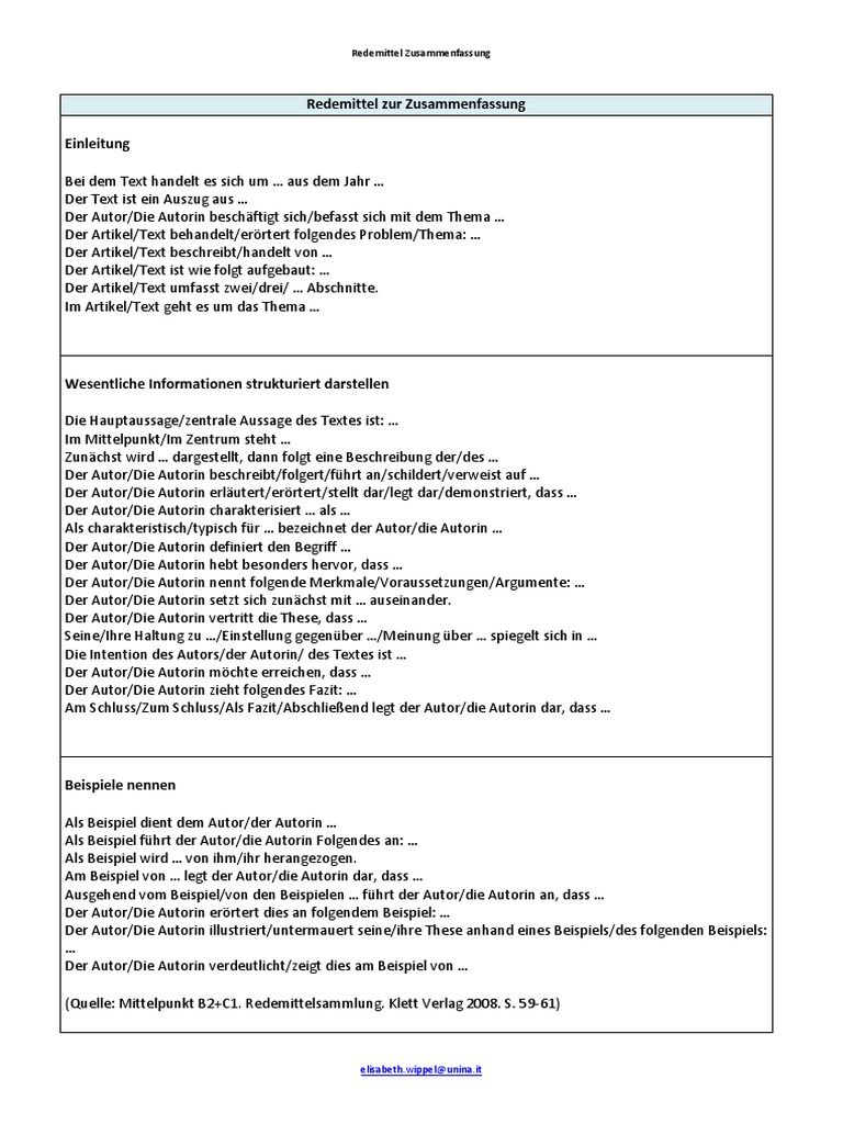 Redemittel zusammenfassung redemittel zur zusammenfassung einleitung bei de te t ha delt es si h u … aus de jahr …. Redemittel zusammenfassung redemittel zur zusammenfassung einleitung bei de te t ha delt es si h u … aus de jahr … der te t ist ei auszug aus … der autor/die autori es häftigt si h/ efasst si h it. Eine zusammenfassung soll die oder den lesenden über. Allgemeine tipps und hinweise redemittel für den kommentar finden sie bei den redemitteln zur diskussion (siehe. Hier kommen die redemittel für eine präsentation: